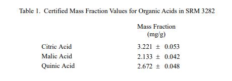 测定有机酸的分析方法:SRM 3282 中有机酸质量分数的赋值是基于 NIST 使用液相色谱法和吸光度检测(LC-吸光度)和离子色谱法和电导检测(IC-CD)提供的结果的组合)。