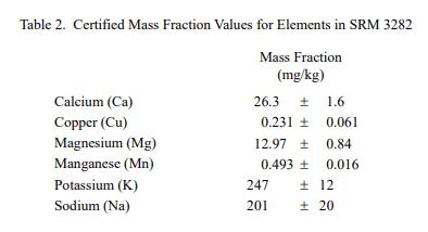 有机酸和元素的认证质量分数值分别在表 1 和表 2 中提供。 NIST 认证值是 NIST 对其准确性具有最高置信度的值,因为所有已知或可疑的偏差来源都已被调查或考虑在内 [1]。价值分配分析由 NIST 和合作实验室进行。认证值计算为 NIST 方法的平均值和合作实验室提供的平均结果的中位数(如果适用)。相关的不确定性以大约 95% 的置信水平表示 [2-4]。