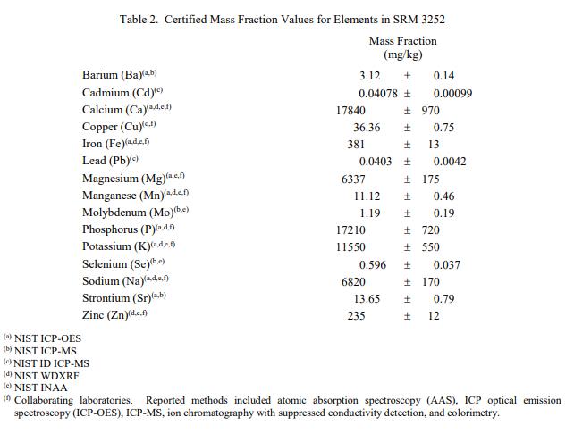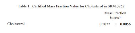 表 1 至表 3 中提供了NIST SRM 3252蛋白质饮料混合物中胆固醇、元素和维生素的认证质量分数值,以干质量为基础报告。NIST 认证值是 NIST 认证的值对其准确性的信心最高,因为所有已知或可疑的偏差和可变性来源都已考虑在内 [1]。价值分配分析由 NIST 和合作实验室进行。认证值计算为 NIST 方法的平均值和合作实验室提供的平均结果的中位数(在适当的情况下)。相关的不确定性以大约 95% 的置信水平表示 [2-4]。