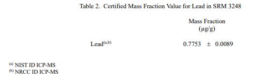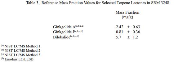 NIST SRM 3248银杏片NIST 参考值是未经认证的值,它是基于可用数据对真实值的最佳估计;但是,该值不符合 NIST 的认证标准 [1],并带有相关的不确定性,这些不确定性可能仅反映测量再现性,可能不包括所有不确定性来源,或者可能反映多种分析方法之间缺乏足够的统计一致性。表 3 中提供了其他萜内酯的参考浓度值。表 4 中提供了砷、镉和汞的参考值。