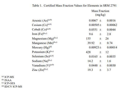 表 1 提供了 SRM 2791 中元素的认证质量分数值,以干质量为基础报告。NIST 认证值是 NIST 对其准确性有最高置信度的值,在所有已知的或怀疑的偏倚来源已被调查或考虑[1]。 NIST 进行了赋值分析。元素的认证质量分数值计算为平均值