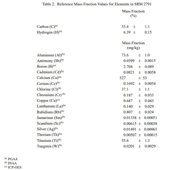 表 2 和表 3 中提供了其他元素的参考质量分数值,以干质量为基础报告,以及 SRM 2791 中的灰分。NIST 参考质量分数值是最佳估计值的非认证值基于可用数据的真实值;但是,这些值不符合 NIST认证标准 [1] 提供的不确定度可能仅反映测量再现性,可能不包括所有不确定性来源,或者可能反映多种分析方法之间缺乏足够的统计一致性。参考质量分数值来自 NIST 报告的结果。