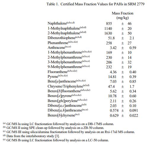 表 1 中提供了 21 种 PAH 的认证质量分数值。NIST 认证值是 NIST 对其准确性有最高置信度的值,因为所有已知或可疑的偏差来源都已被调查或考虑在内帐户 [1]。认证值基于以下协议在 NIST 使用多种分析技术获得的结果。
