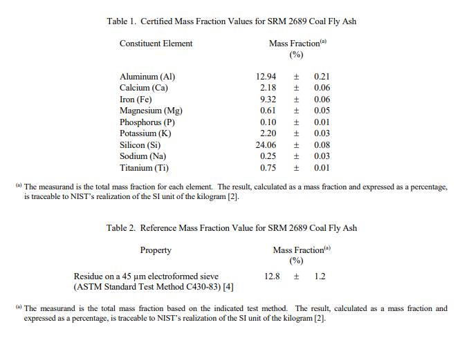 NIST SRM 2689粉煤灰(标准品)旨在用于评估用于粉煤灰分类和测定粉煤灰或类似基质材料中的组成元素的分析方法。一个 SRM 2689 单元由三个 10 g 密封的粉煤灰玻璃小瓶组成,粉煤灰粉碎至小于150 μm 粒径并混合至高度均匀性。