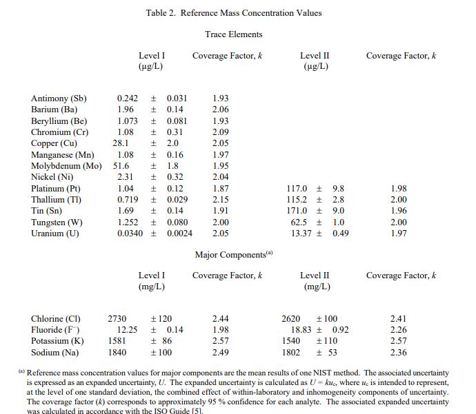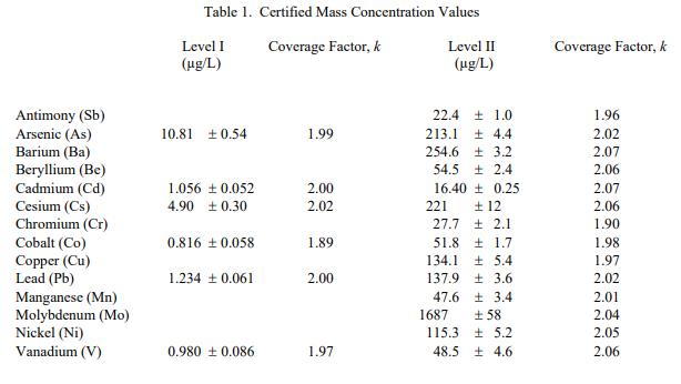 表 1 列出了 SRM 2668 的 I 级 6 种元素和 II 级 14 种元素的认证质量浓度值。 NIST 认证值是 NIST 对其准确性有最高信心的值已知或可疑的偏见来源已被调查或考虑帐户 [1]。数值来自 NIST 和合作实验室提供的结果的组合。