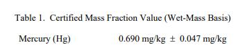表 1 中提供了汞的认证值,表示为基于湿质量(原样)的质量分数 [1]。该值基于使用冷蒸气同位素稀释的主要方法进行的分析电感耦合等离子体质谱 (CV-ID-ICP-MS) [2,3]。 NIST 认证值是 NIST 对其准确性具有最高置信度的值,因为所有已知或可疑的偏差来源都已被调查或考虑 [4]。认证值的不确定度以扩展不确定度的形式给出,以大约 95% 的置信度覆盖被测量。扩展的不确定性计算为 U = kuc 其中uc 是与 ISO/JCGM 指南 [5] 一致的组合不确定度,k 是对应于大约 95% 置信度的覆盖因子 (k = 2)。被测量是表 1 中列出的汞的总质量分数。计量可溯源至 SI 派生的质量分数单位(以毫克每千克表示)