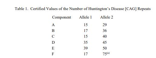 表 1 列出了每个成分的 [CAG] 重复次数的认证值。这些认证值是通过 Sanger 测序技术计算组成等位基因中 [CAG] 重复单元的数量来确定的,并通过片段分析(基因分型)确认。独立的正向和反向测序和片段分析结果之间的完全一致提供了对规定整数计数的最高置信度。探索了其他技术,没有理由怀疑这些结果。 NIST 认证值是 NIST 对其准确性有最高置信度的值,因为所有已知或可疑的偏差来源都已调查。这CAG 重复次数的认证值可追溯到 SI 计数单位 (1)。