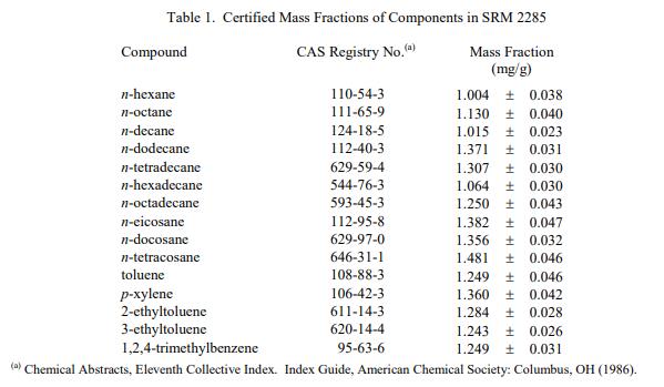 表 1 中给出了 15 种成分的认证值。这些值是基于从该溶液的重量法制备中获得的结果以及使用气相色