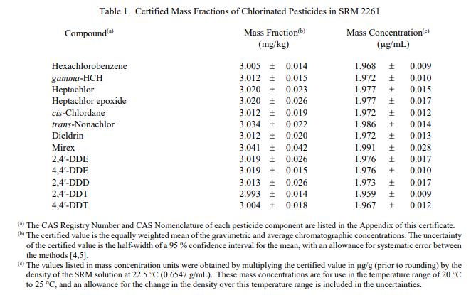 表 1 给出了 15 种农药中 13 种农药的认证质量分数和估计不确定度。这些值基于该溶液的重量法制备中使用的数量以及使用气相色谱法获得的分析结果(GC) 并以质量分数单位报告 [1]。 NIST 认证值是 NIST 对其准确性具有最高置信度的值,因为所有已知或可疑的偏差来源都已被调查或考虑在内 [2]。被测量是表 1 中列出的农药,认证值在计量上可追溯至以微克/千克表示的质量分数的 SI 派生单位。