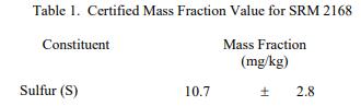 已知或可疑的偏倚来源已被调查或考虑 [2]。认证值是根据 NIST 和合作实验室使用表 4 中所示测试方法进行的分析结果对真实值的当前最佳估计。