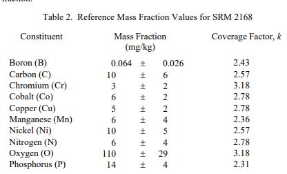 表 2 中报告了 10 种成分的参考值。参考值是未经认证的值,是当前对真实值的最佳估计。但是,这些值不符合 NIST 认证标准,并且提供了相关的不确定性,可能不包括所有不确定性来源 [2]。