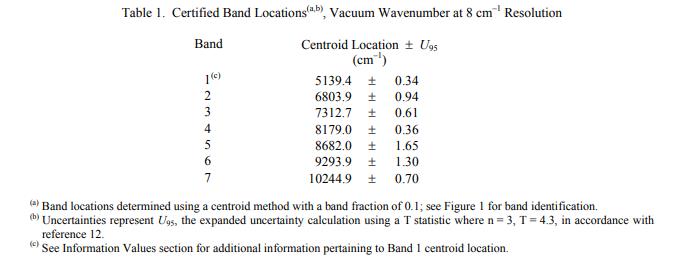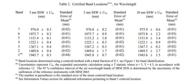 表 1 列出了 7 个反射吸收波段的认证真空波数位置,范围从 10 300 cm-1 到 5 130 cm-1。7 个 NIR 空气波长波段位置的认证值表 2 列出了从 976 nm 到 1946 nm 的反射吸收波段。 NIST 认证值是 NIST 对其准确性有最高置信度的值,因为所有已知或可疑的偏差来源都已被充分调查或考虑在内[1]。