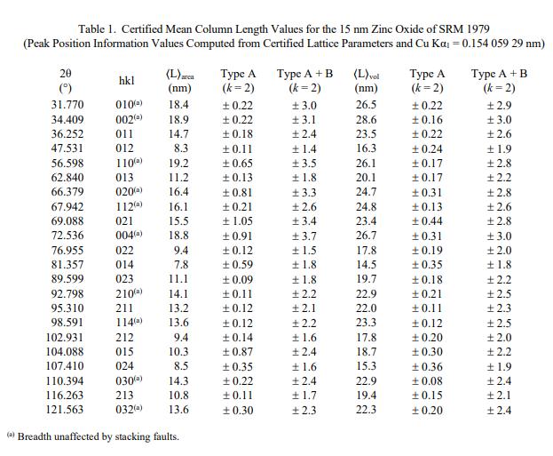 NIST 认证值是 NIST 对其准确性有最高置信度的值,因为所有已知或可疑的偏差来源都已被调查或考虑在内。被测量是经验证的平均柱长,由 22 条衍射线的傅里叶分析确定,晶格参数为由 Pawley 分析确定。计量溯源性是国际单位制 (SI) 长度单位(以纳米表示)。表 1 至表 4 中提供了认证值和不确定度,并根据 ISO/JCGM 指南 [3] 中描述的方法计算。
