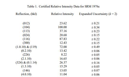 NIST 认证值是 NIST 对其准确性有最高置信度的值,因为所有已知或可疑的偏差来源都已被调查或考虑在内。被测量是表 1 中所示的相对强度(无量纲比)的认证值,以及表 2 中所示的晶格参数。计量溯源性是国际单位制 (SI) 单位,相对强度值是维度为一,对于晶格参数,维度是长度(以纳米表示)。认证值和不确定度是根据 ISO/JCGM 指南 [1] 中描述的方法计算的。