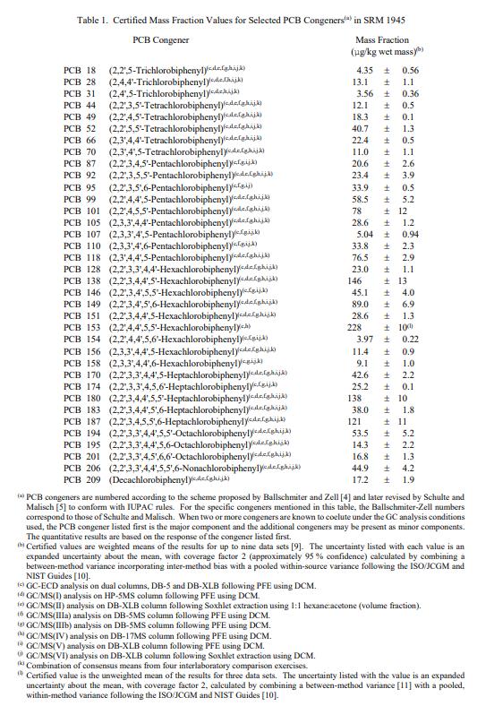 测量值是分别在表 1、2 和 3 中提供的每种 PCB 同系物、氯化农药和 PBDE 同系物的总质量分数。计量溯源性是质量分数的 SI 派生单位(以微克/千克湿基表示)。 NIST 认证值是对其准确性有最高置信度的值,因为所有已知或可疑的偏差来源都已被调查或考虑在内 [2]。 PCB 同系物、氯化农药和 PBDE 同系物的认证值基于 NIST 从两种或多种化学独立分析技术获得的结果与实验室间比较研究结果的一致性。