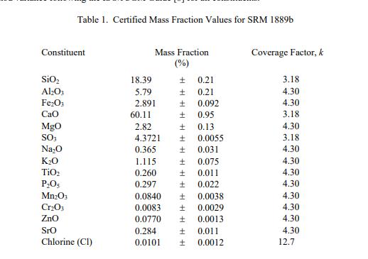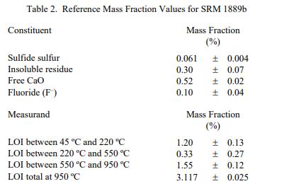 SRM 1889b 成分的认证值在表 1 中报告为收到时的质量分数 [1]。 NIST 认证值是 NIST 对其准确性具有最高置信度的值,因为所有已知或可疑的偏差来源都已被调查或考虑在内 [2]。认证值是根据 NIST 和合作执行的分析结果对真实值的当前最佳估计使用表 4 中列出的仪器和经典测试方法的实验室。
