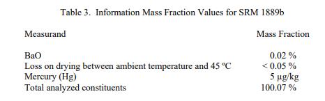 表 3 中报告了成分的信息值、环境温度和 45 ºC 之间的 LOI 以及总分析成分的信息值。信息值被认为是 SRM 用户可能感兴趣的值,但没有足够的信息来评估与值相关的不确定性 [2]。信息值不能用于建立计量溯源性。