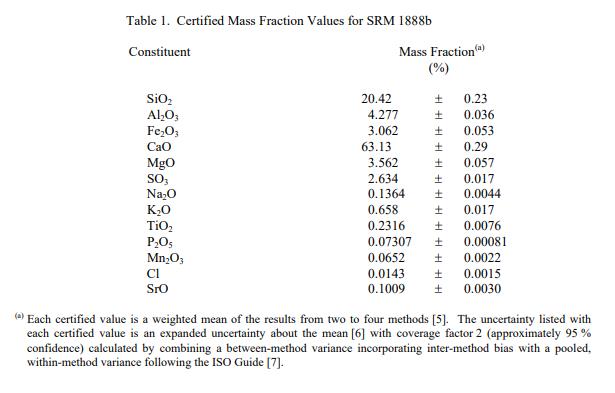 信息值:NIST SRM 1888b 硅酸盐水泥(标准品)表 3 中报告了两个信息值。信息值被认为是 SRM 用户感兴趣的值,但没有足够的信息来评估与值相关的不确定性 [2]。