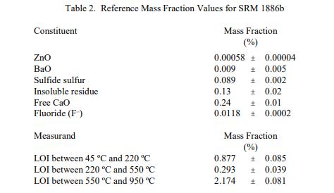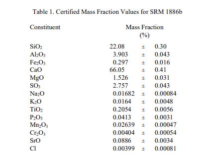 表 2 中报告了成分和烧失量 (LOI) 的参考值。NIST 参考值是未经认证的值,是基于可用数据对真实值的当前最佳估计;但是,该值不符合 NIST 认证标准,并提供了相关的可能仅反映测量重现性的不确定性,可能不包括所有不确定性来源,或可能反映多种分析方法之间缺乏足够的统计一致性 [2]。
