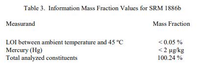 SRM 1886b 成分的认证值在表 1 中报告为收到时的质量分数 [1]。 NIST 认证值是 NIST 对其准确性具有最高置信度的值,因为所有已知或可疑的偏差来源都已被调查或考虑在内 [2]。认证值是对真实值的当前最佳估计。