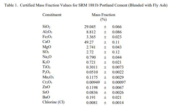 SRM 1881b 成分的认证值在表 1 中报告为质量分数 [1]。 NIST 认证值是 NIST 对其准确性具有最高置信度的值,因为所有已知或可疑的偏差来源都已被调查或考虑在内 [2]。认证值是存在的真实值的最佳估计。