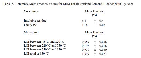 成分和烧失量 (LOI) 的参考值在表 2 中报告为质量分数。 NIST 参考值是未经认证的值,它是基于可用数据对真实值的当前最佳估计;但是,该值不符合 NIST 认证标准并提供相关的不确定性可能仅反映测量再现性,可能不包括所有不确定性来源,或者可能反映多种分析方法之间缺乏足够的统计一致性 [2]。