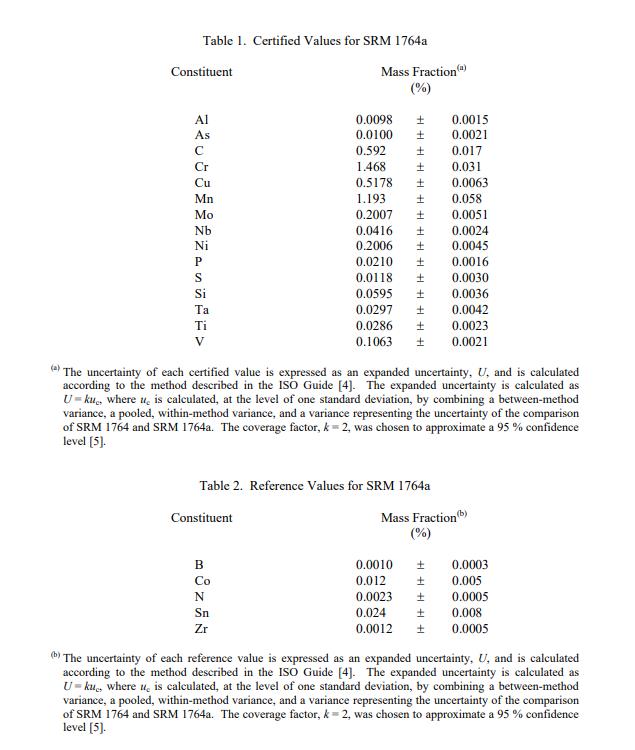表 1 报告了 SRM 1764a 的 15 种成分的认证值。对于所有元素,值均以质量分数报告 [1]。赋值类别基于 NIST 用于化学成分参考材料的术语和模式的定义 [2]。 NIST 认证值是 NIST 对其准确性有最高置信度的值,因为所有已知或可疑的偏差来源都已被调查或考虑在内。认证值是根据 NIST 和合作实验室使用仪器和经典测试方法进行的分析结果对真实值的当前最佳估计。参考值:表 2 中报告了五种成分的参考值。参考值是非认证值,是真实值的最佳估计值 [2]。但是,这些值不符合 NIST认证标准,并提供相关的不确定性,可能不包括所有不确定性来源。