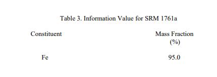 表 1 报告了 SRM 1761a 的 14 种成分的认证值。表 2 报告了七种成分的参考值。表 3 报告了 Fe 的信息值。对于所有元素,值都以质量分数报告 [1]。赋值类别基于 NIST 用于化学参考材料 [2] 的术语和模式的定义。
