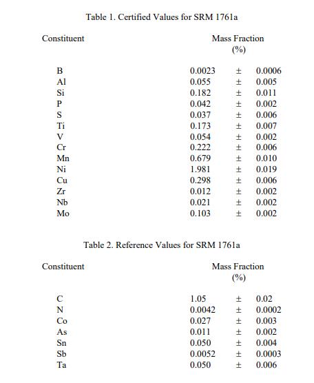 SRM 1761a 的值分配基于此 SRM 与原始 SRM 1761 的完整、高精度比较。SRM 1761a 的材料被证明与所有元素的原始材料没有区别,除了 C、N 和 V . SRM 1761a 的赋值被认为可以直接追溯到用于 SRM 1761 赋值的主要参考物质和校准。C 和 N 的赋值是使用基于 SRM 1761 的校准通过燃烧和红外检测获得的。V 的赋值是通过 X 射线荧光光谱法获得的基于低合金钢 SRM 1761 至 1768 的校准。在此证书中列出了赋值中采用的测试方法。